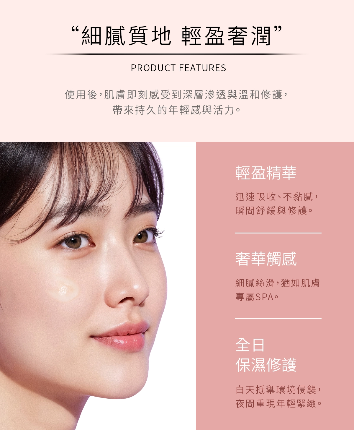 產品特色 | 親膚的水潤質地加速前導吸收,無酒精、無香精添加使用更安心,迅速補水保濕、舒緩肌膚不適,給你最天然的肌膚精華導入 |