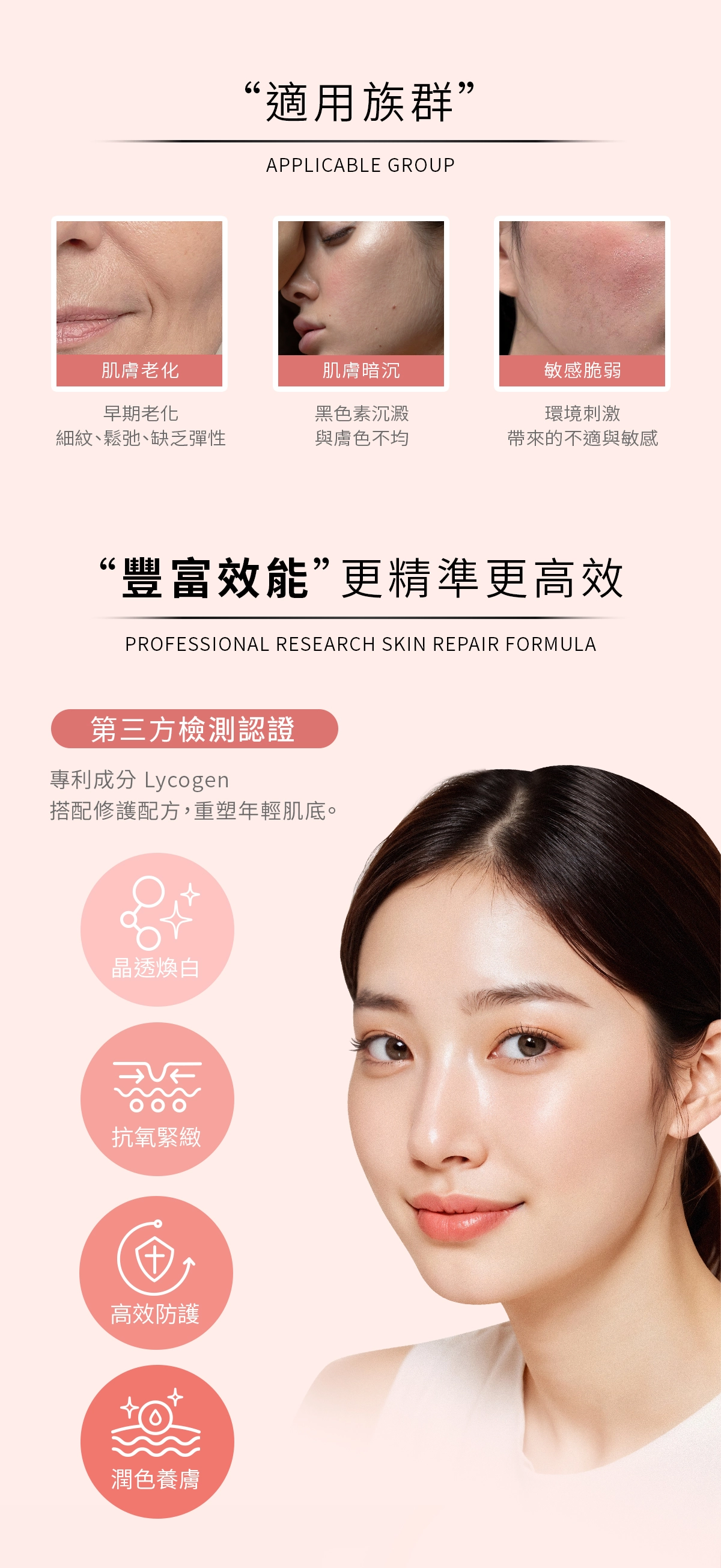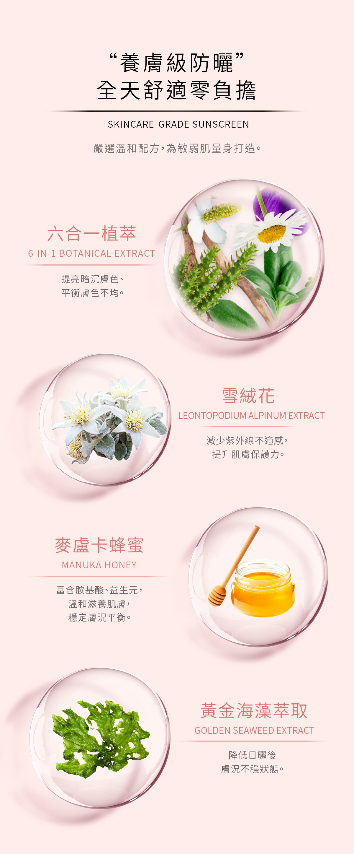 注意事項 | 外用保養品,因個人膚質不同,如有皮膚出現不適,或皮膚有紅、腫、熱、痛、癢等過敏反應,請停止使用,並立即以大量清水徹底沖洗及諮詢專業醫師建議。 |